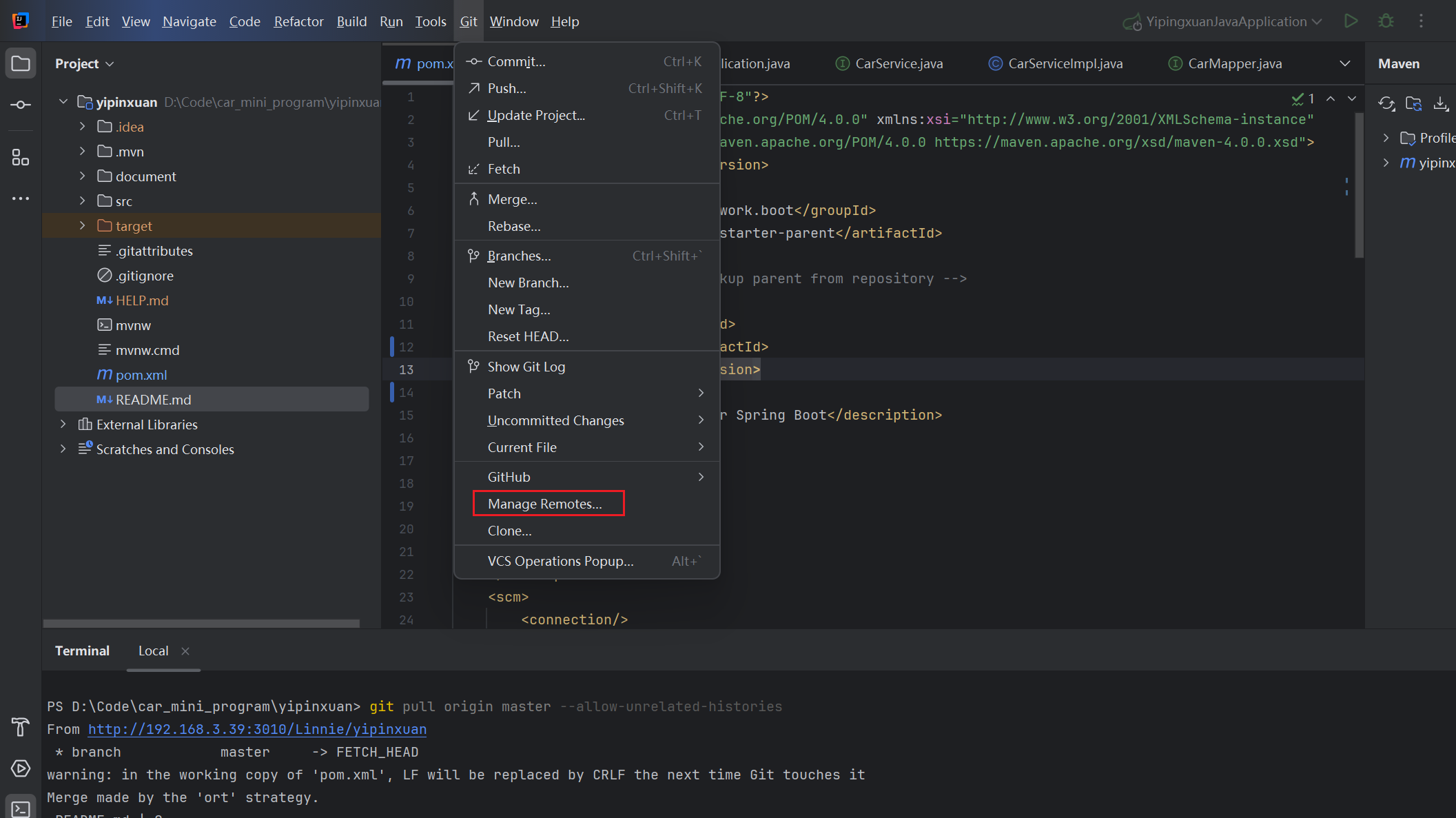 接着在IJ上push,发现报错,因为origin仓和本地仓不是一个节点,处理方法是,打开terminal,输入如下命令