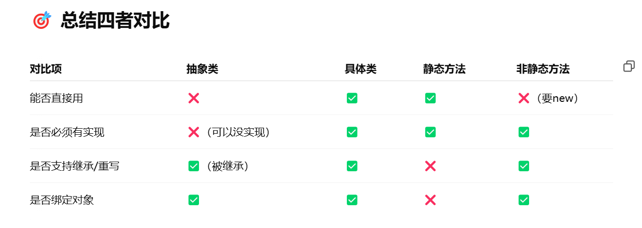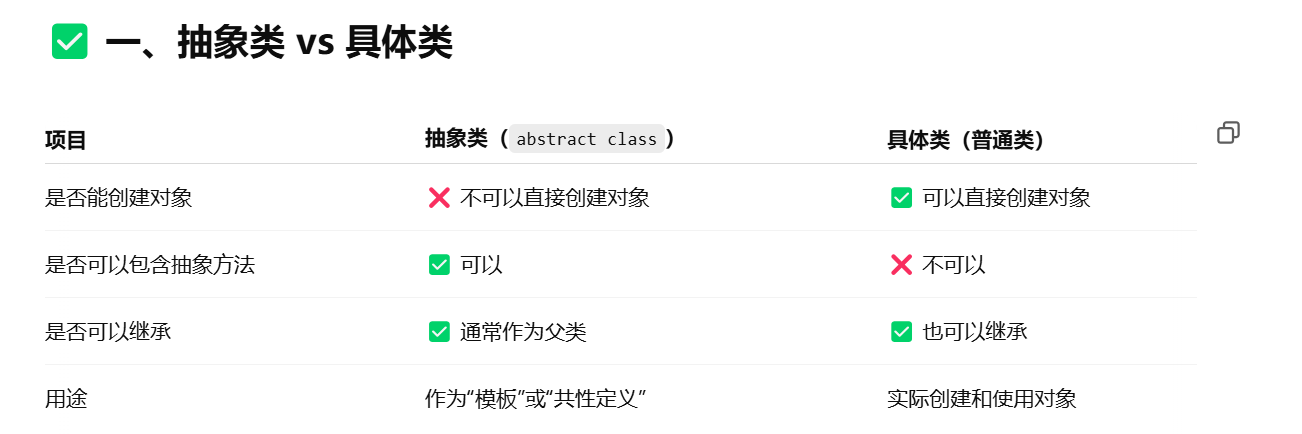 - 抽象类就像“设计图”:不能直接用,但可以派生出实物(子类)