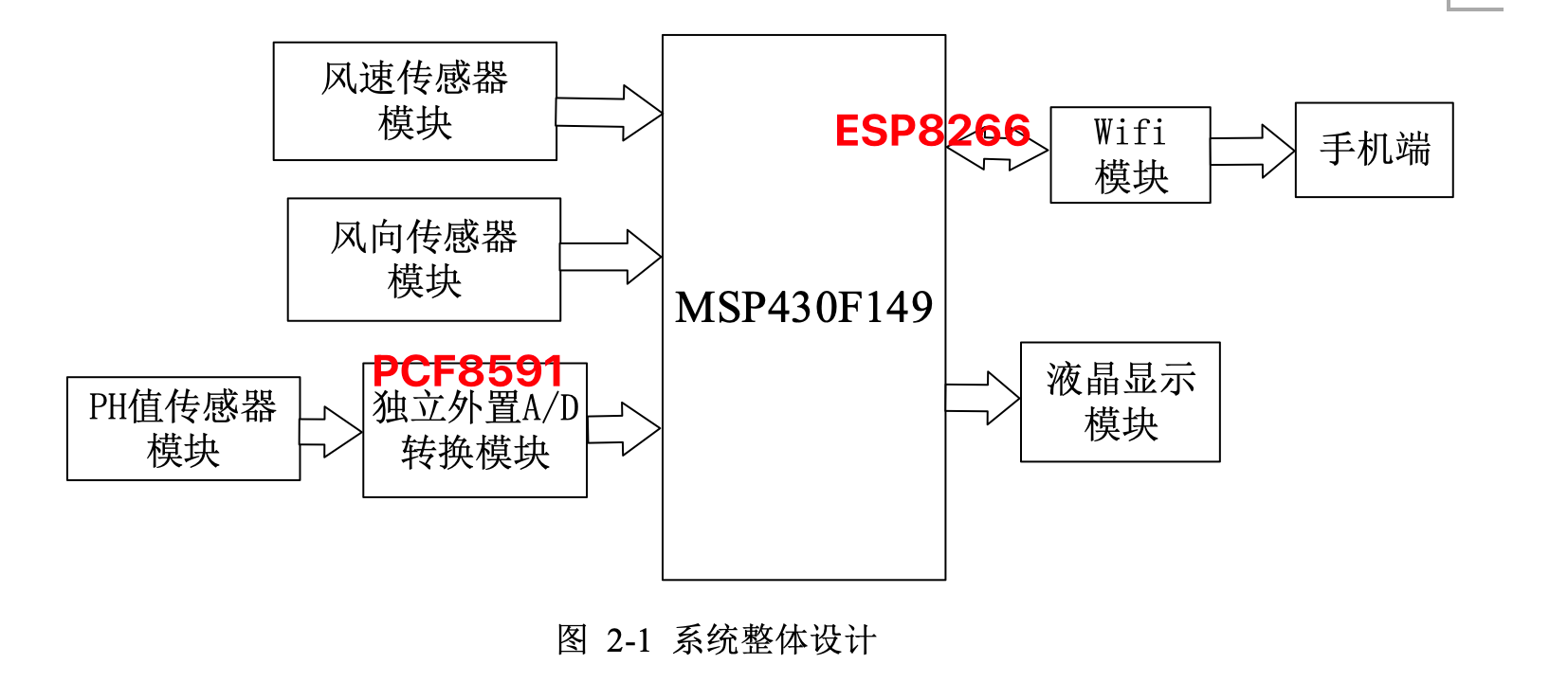 以MSP430F149 芯片为核心,集成风速、风向及土壤 PH 值传感器,通过内置/外置 A/D 转换模块处理信号,结合 ESP8266 WiFi 模块实现环境数据远程传输至手机端,并利用 OLED 屏实时显示监测信息。