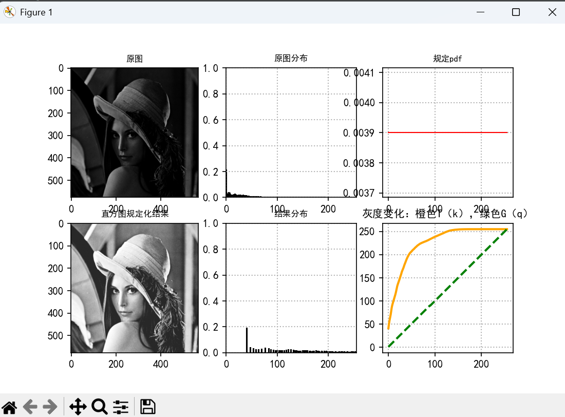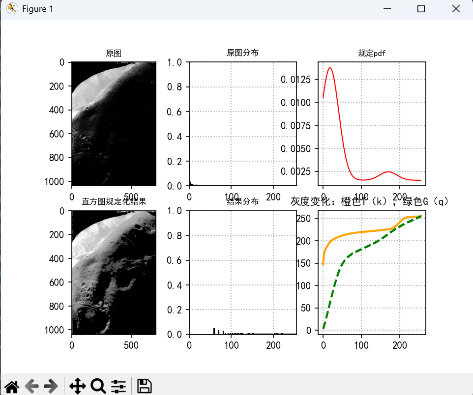 #窗口显示:原图,原图灰度分布、规定PDF,结果图像,结果图像灰度分析,对应变换函数