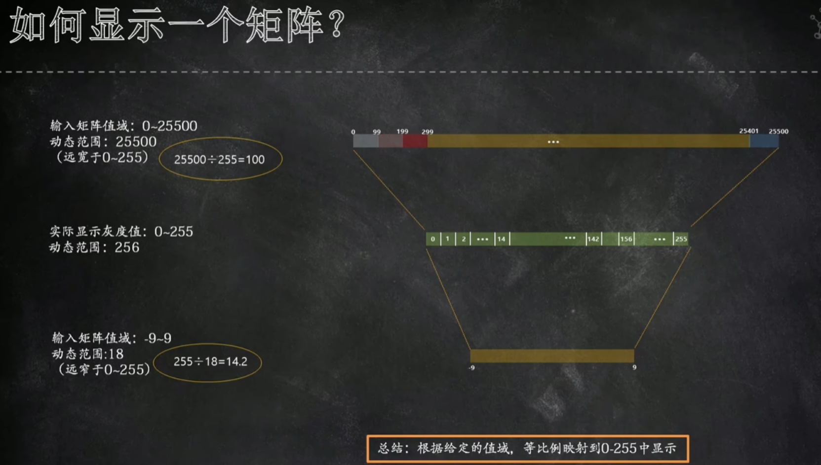 如果给定矩阵的值域为0~25500或是-9~9,则我们需要将值域等比例映射至0~255的区间内,才能清晰看到图像。